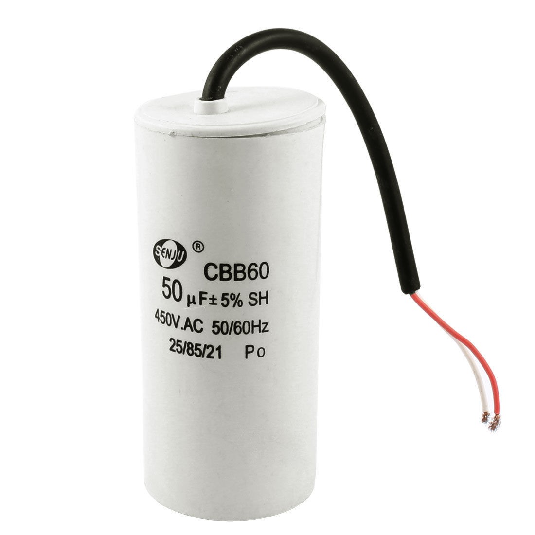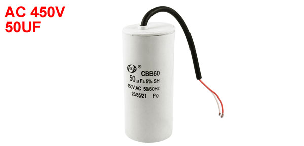 Product Name Motor Run Capacitor Model CBB60 Rated Capacitance 50uF Tolerance ±5% Rated Voltage 450V AC Frequency 50/60Hz Body Size 12 x 5.3cm / 4.7" x 2.1"(H*D) Wire Length 18cm / 7.1" Main Material Polypropylene Film, PVC Main Color White Weight 258g Package Content 1 x Motor Run Capacitor - Reviews