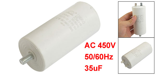 Product Name Motor Capacitor Model CBB60 Material(External) Plastic, Metal Rated Capacitance 35µF Tolerance ±5% Rated Frequency 50/60Hz Rated Voltage AC 450V Overall Size 9.7 x 4.6cm/3.82" x 1.81" (L * D) Thread Diameter 8mm/ 0.31" Wiring Hole Diameter