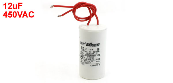 Product Name Motor Capacitor Housing Material Plastic Dielectric Material Metallized Polypropylene Film Model CBB60A-1 Capacitance 12uF Tolerance ±5% Rated Voltage 450VAC Frequency 50/60Hz Temperature Coefficient 40/70/21 Body Size 3.8 x 7.3cm / 1.5" x 2.9" (D * H) Wire Length 15.5cm / 6.1" Color White, Red Weight 69g Package Content 1 x Motor Capacitor - Reviews