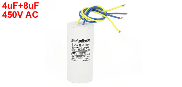 Product Name Motor Run Capacitor Material Polypropylene Film Model No. CBB60A-1 Rated Capacitance 4uF+8uF Tolerance 5% Rated Frequency 50/60 Hz Rated Voltage 450V AC Temperature Coeffcient 40/70/21 Body Size 9 x 4.2cm/3.5" x 1.65"(H*D) Cable Length 19cm/7.5" Main Color White, Yellow, Blue Net Weight 115g Package Content 1 x Motor Run Capacitor  - Reviews