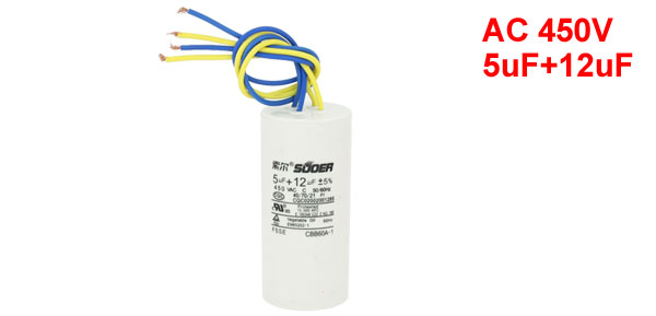 Product Name Motor Run Capacitor Material Polypropylene Film Model No. CBB60A-1 Rated Capacitance 5uF+12uF Tolerance 5% Rated Frequency 50/60 Hz Rated Voltage 450V AC Temperature Coeffcient 40/70/21 Body Size 9 x 4.2cm/3.5" x 1.65"(H*D) Cable Length 19cm/7.5" Main Color White, Yellow, Blue Net Weight 115g Package Content 1 x Motor Run Capacitor - Reviews