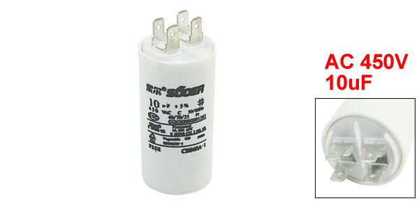 Product Name Motor Capacitor Model CBB60A-1 Dielectric Material Polypropylene Film Housing Material Plastic Capacitance 10µF Tolerance ±5% Rated Frequency 50/60Hz Rated Voltage AC 450V Size 3.3 x 7cm/ 1.3" x 2.7" (Dia.*H) Pin Number 4 Color White Weight 60g Package Content 1 x Motor Capacitor - Reviews