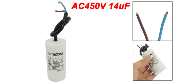 Product Name Polypropylene Film Capacitor Housing Material Plastic Dielectric Material Polypropylene Model CBB60A-1 Capacitance 14uF Tolerance 5% Rated Voltage 450VAC Frequency 50/60Hz Body Size 3.4 x 7cm/ 1.34" x 2.76" (D*H) Cable Length 20cm/ 7.87" Color White, Black Weight 65g Package Content 1 x Polypropylene Film Capacitor - Reviews