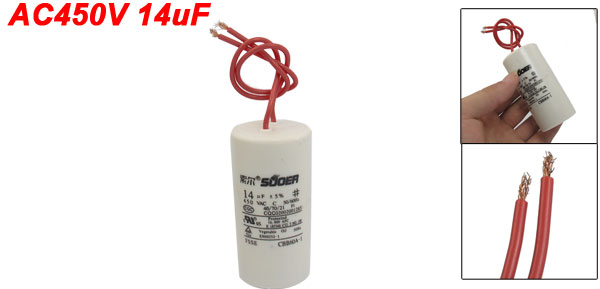 Product Name Polypropylene Film Capacitor Housing Material Plastic Dielectric Material Polypropylene Model CBB60A-1 Capacitance 14uF Tolerance 5% Rated Voltage 450VAC Frequency 50/60Hz Body Size 3.7 x 7.5cm/ 1.46" x 2.95" (D*H) Cable Length 15cm/ 5.9" Color White, Red Weight 76g Package Content 1 x Polypropylene Film Capacitor - Reviews