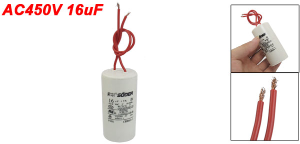Product Name Polypropylene Film Capacitor Housing Material Plastic Dielectric Material Polypropylene Model CBB60A-1 Capacitance 16uF Tolerance ±5% Rated Voltage 450VAC Frequency 50/60Hz Body Size 3.7 x 7.5cm/ 1.46" x 2.95" (D*H) Cable Length 15cm/ 5.9" Color White, Red Weight 70g Package Content 1 x Polypropylene Film Capacitor - Reviews
