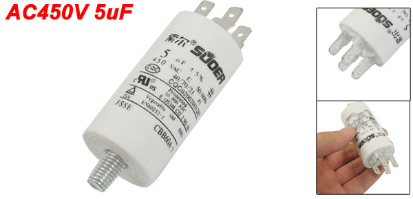Product Name Motor Capacitor Model CBB60A-1 Dielectric Material Polypropylene Film Housing Material Plastic Capacitance 5µF Tolerance ±5% Rated Frequency 50/60Hz Rated Voltage AC 450V Size 3 x 8.3cm/ 1.18" x 3.27" (Dia.*H) Thread Diameter 8mm/ 0.31" Color White Weight 42g Package Content 1 x Motor Capacitor - Reviews