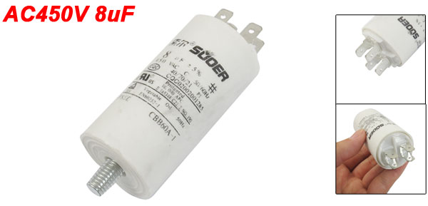 Product Name Motor Capacitor Model CBB60A-1 Dielectric Material Polypropylene Film Housing Material Plastic Capacitance 8µF Tolerance ±5% Rated Frequency 50/60Hz Rated Voltage AC 450V Size 3.4 x 9.2cm/ 1.34" x 3.62" (Dia.*H) Thread Diameter 8mm/ 0.31" Color White Weight 62g Package Content 1 x Motor Capacitor - Reviews