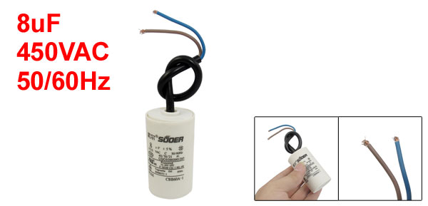 Product Name Polypropylene Film Capacitor Housing Material Plastic Dielectric Material Polypropylene Model CBB60A-1 Capacitance 8uF Tolerance ±5% Rated Voltage 450VAC Frequency 50/60Hz Body Size 3.4 x 6.2cm/ 1.34" x 2.44" (D*H) Cable Length 19cm/ 7.5" Color White, Black Weight 58g Package Content 1 x Polypropylene Film Capacitor - Reviews