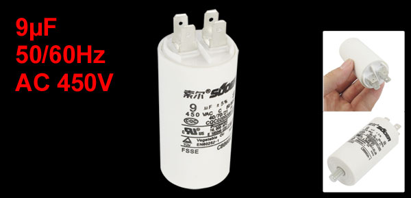 Product Name Motor Capacitor Model CBB60A-1 Dielectric Material Polypropylene Film Housing Material Plastic Capacitance 9µF Tolerance ±5% Rated Frequency 50/60Hz Rated Voltage AC 450V Size 3.4 x 9.2cm/ 1.34" x 3.62" (Dia.*H) Thread Diameter 8mm/ 0.31" Color White Weight 60g Package Content 1 x Motor Capacitor - Reviews