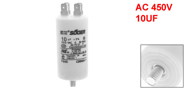 Product Name Motor Capacitor Housing Material Plastic Dielectric Material Metallized Polypropylene Film Model CBB60A-1 Capacitance 10uF Tolerance ±5% Rated Voltage 450VAC Frequency 50/60Hz Body Size 4 x 7cm/1.6" x 2.8"(D*H) Main Color White Weight 87g Package Content 1 x Motor Capacitor - Reviews
