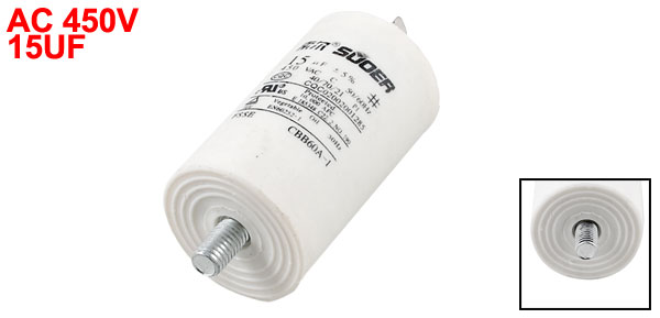 Product Name Motor Capacitor Housing Material Plastic Dielectric Material Metallized Polypropylene Film Model CBB60A-1 Capacitance 15uF Tolerance +/-5% Rated Voltage 450VAC Frequency 50/60Hz Body Size 4 x 7cm/1.6" x 2.8"(D*H) Main Color White Weight 87g Package Content 1 x Motor Capacitor - Reviews