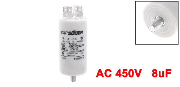 Product Name Motor Capacitor Housing Material Plastic Dielectric Material Metallized Polypropylene Film Model CBB60A-1 Capacitance 8uF Tolerance ±5% Rated Voltage 450VAC Frequency 50/60Hz Body Size 4 x 7cm/1.6" x 2.8"(D*H) Main Color White Weight 87g Package Content 1 x Motor Capacitor - Reviews