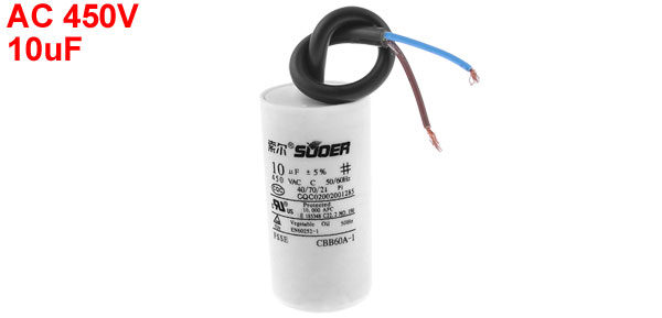 Product Name Motor Capacitor Housing Material Plastic Dielectric Material Polypropylene Model CBB60A-1 Capacitance 10uF Tolerance ±5% Rated Voltage 450V AC Frequency 50/60Hz Body Size 3 x 7cm / 1.2" x 2.8" (D * H) Wire Size(Approx.) 17.5 x 0.6cm /6.9" x 0.23" (L * Max.D) Color Black, White Weight 57g Package Content 1 x Motor Capacitor - Reviews