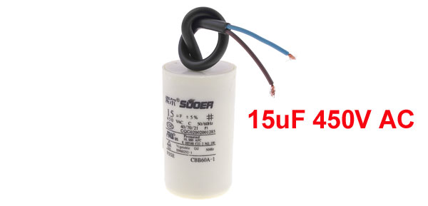 Product Name Motor Capacitor Housing Material Plastic Dielectric Material Polypropylene Model CBB60A-1 Capacitance 15uF Tolerance ±5% Rated Voltage 450V AC Frequency 50/60Hz Body Size 3.5 x 7cm / 1.4" x 2.8" (D * H) Wire Size(Approx.) 17.5 x 0.6cm /6.9" x 0.23" (L * Max.D) Color Black, White Weight 87g Package Content 1 x Motor Capacitor - Reviews