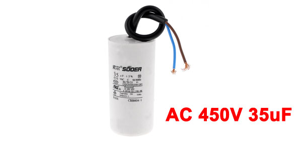 Product Name Motor Capacitor Housing Material Plastic Dielectric Material Polypropylene Model CBB60A-1 Capacitance 35uF Tolerance ±5% Rated Voltage 450V AC Frequency 50/60Hz Body Size 4 x 9cm / 1.6" x 3.5" (D * H) Wire Size(Approx.) 17.5 x 0.6cm /6.9" x 0.23" (L * Max.D) Color Black, White Weight 77g Package Content 1 x Motor Capacitor - Reviews