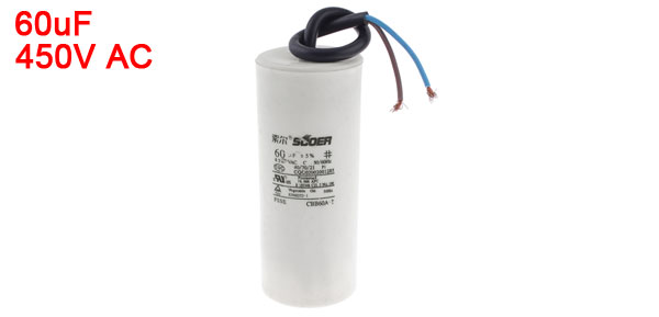 Product Name Motor Capacitor Housing Material Plastic Dielectric Material Polypropylene Model CBB60A-1 Capacitance 60uF Tolerance ±5% Rated Voltage 450V AC Frequency 50/60Hz Body Size 5 x 12cm / 2" x 4.7" (D * H) Wire Size(Approx.) 17.5 x 0.6cm /6.9" x 0.23" (L * Max.D) Color Black, White Weight 87g Package Content 1 x Motor Capacitor - Reviews