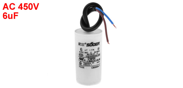 Product Name Motor Capacitor Housing Material Plastic Dielectric Material Polypropylene Model CBB60A-1 Capacitance 6uF Tolerance ±5% Rated Voltage 450V AC Frequency 50/60Hz Body Size 3 x 7cm / 1.2" x 2.8" (D * H) Wire Size(Approx.) 17.5 x 0.6cm /6.9" x 0.23" (L * Max.D) Color Black, White Weight 67g Package Content 1 x Motor Capacitor - Reviews