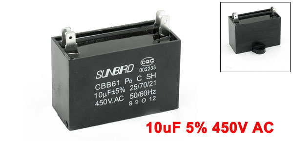 Product Name Motor Capacitor Housing Material Plastic Dielectric Material Polypropylene Film Model CBB61 Capacitance 10uF Tolerance ±5% Rated Voltage 450VAC Frequency 50/60Hz Pin Spacing(Approx.) 4.2cm/1.65'', 0.5cm/0.2'' Overall Size 5.8 x 4.7 x 3.8cm/2.3'' x 1.85'' x 1.5'' (L*W*H) Color Black Weight 69g Package Content 1 x Motor Capacitor - Reviews