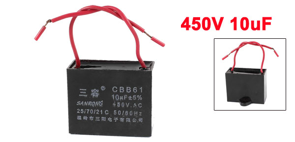 Product Name Motor Capacitor Model CBB61 External Material Plastic Dielectric Material Metalized Polypropylene Film Rated Capacitance 10uF Tolerance ±5% Rated Frequency 50/60Hz Rated Voltage AC 450V Body Size 50 x 23 x 40mm/ 2" x 0.9" x 1.6"(L*W*T) Fixing Hole Diameter 4mm/0.16" Cable Length 9.5cm/ 3.7" Net Weight 47g Package Content 3 x Motor Run Capacitor - Reviews