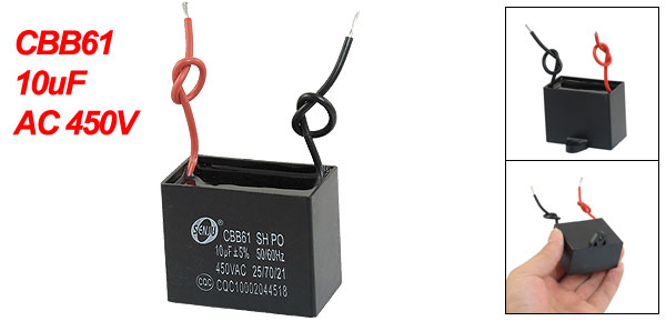 Product Name Motor Capacitor Model CBB61 External Material Plastic Dielectric Material Metalized Polypropylene Film Rated Capacitance 10uF Tolerance +/-5% Rated Frequency 50/60Hz Rated Voltage AC 450V Body Size 4.9 x 3.9 x 2.8cm/ 1.9" x 1.5" x 1.1"(L*W*T) Fixing Hole Diameter 5mm/0.2" Cable Length 9cm/ 3.5" Net Weight 58g Package Content 1 x Motor Run Capacitor - Reviews