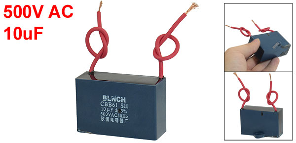 Product Name Motor Capacitor Model CBB61 External Material Plastic Dielectric Material Metalized Polypropylene Film Rated Capacitance 10uF Tolerance +/-5% Rated Frequency 50Hz Rated Voltage AC 500V Body Size 5.8 x 2.3 x 3.8cm/ 2.3" x 0.9" x 1.5"(L*W*T) Mount Hole Diameter 4mm/0.16" Cable Length 10cm/ 3.9" Net Weight 58g Package Content 1 x Motor Run Capacitor - Reviews