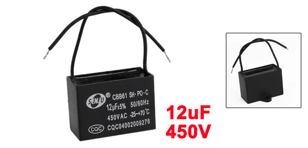 Product Name Capacitor Model CBB61 Material Polypropylene Film Rated Capacitance 12uF Tolerance ±5% Rated Frequency 50Hz Rated Voltage AC 450V Size 5 x 3.5 x 3.5cm/2" x 1.4" x 1.4"(L*W*T) Mounting Hole Diameter 0.48cm/0.19" Cable Length 11cm/ 4.3" Main Color Black Weight 54g Package Content 1 x Capacitor - Reviews