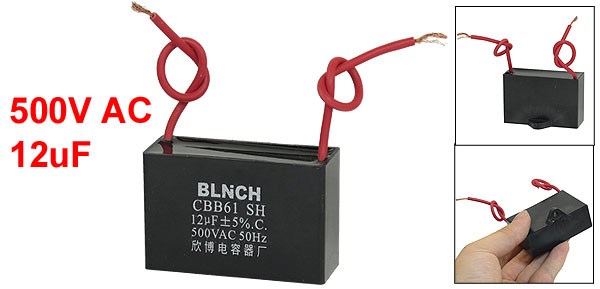 Product Name Motor Capacitor Model CBB61 External Material Plastic Dielectric Material Metalized Polypropylene Film Rated Capacitance 12uF Tolerance +/-5% Rated Frequency 50Hz Rated Voltage AC 500V Body Size 4.8 x 2.2 x 3.8cm/ 1.9" x 0.9" x 1.5"(L*W*T) Mount Hole Diameter 4mm/0.16" Cable Length 10cm/ 3.9" Net Weight 58g Package Content 1 x Motor Run Capacitor - Reviews