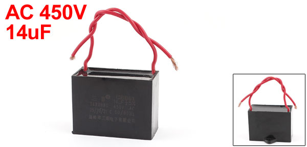 Product Name Motor Capacitor Model CBB61 External Material Plastic Dielectric Material Polypropylene Film Rated Capacitance 14uF Tolerance ±5% Rated Frequency 50/60Hz Rated Voltage AC 450V Ambient Temperature 25/70/21 Body Size 5.8 x 2.8 x 4.3cm/ 2.3" x 1.1" x 1.7"(L*W*T) Mount Hole Diameter 4mm/0.16" Cable Length 9cm/ 3.5" Net Weight 85g Package Content 1 x Motor Run Capacitor - Reviews
