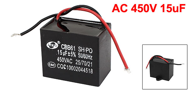 Product Name Motor Capacitor Model CBB61 Color Black External Material Plastic Dielectric Material Metallized Polypropylene Film Rated Capacitance 15uF Tolerance +/15% Rated Frequency 50/60Hz Rated Voltage AC 450V Body Size 50 x 30 x 45mm/ 2" x 1.2" x 1.8"(H*W*T) Fixing Hole Diameter 5mm/0.2" Cable Length 9cm/ 3.5" Net Weight 78g Package Content 1 x Motor Run Capacitor - Reviews
