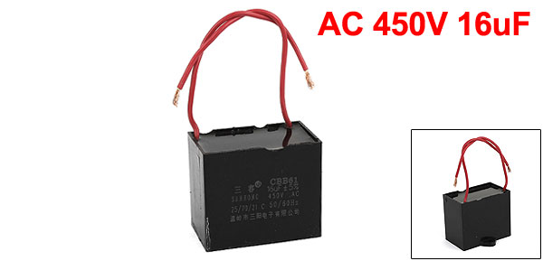 Product Name Motor Run Capacitor Model CBB61 Material Metalized Polypropylene Film Rated Capacitance 16uF Tolerance 5% Operating Temperature 40/70/21 Rated Frequency 50/60 Hz Rated Voltage 450V AC Size 5.7 x 2.7 x 5cm/ 2.3" x 1.1" x 2"(L*W*H) Lead Length 13cm/ 5.1" Weight 95g Package Content 1 x Motor Run Capacitor - Reviews