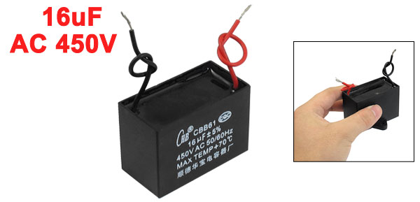 Product Name Motor Capacitor Model CBB61 External Material Plastic Dielectric Material Polypropylene Film Rated Capacitance 16uF Tolerance +/-5% Rated Frequency 50/60Hz Rated Voltage AC 450V Max Temperature +70C Body Size 6 x 4.2 x 3cm/ 2.4" x 1.7" x 1.2"(L*W*T) Mount Hole Diameter 4.5mm/0.2" Cable Length 9cm/ 3.5" Net Weight 82g Package Content 1 x Motor Run Capacitor - Reviews