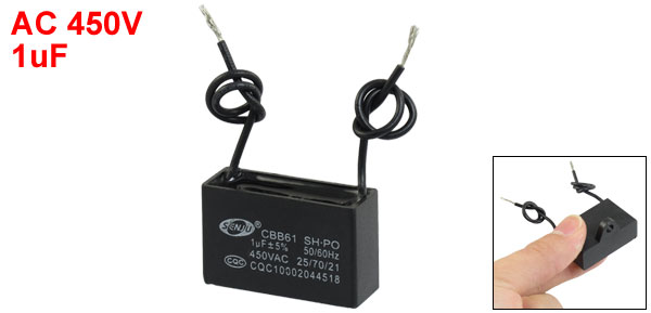 Product Name Motor Capacitor Model CBB61 External Material Plastic Dielectric Material Metalized Polypropylene Film Rated Capacitance 1uF Tolerance +/-5% Rated Frequency 50/60Hz Rated Voltage AC 450V Body Size 3.5 x 2.2 x 1.3cm/ 1.4" x 0.9" x 0.5"(L*W*T) Fixing Hole Diameter 4.5mm/0.2" Cable Length 9cm/ 3.5" Net Weight 13g Package Content 1 x Motor Run Capacitor - Reviews