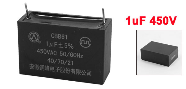 Product Name Ceiling Fan Capacitors Model CBB61 for Ceiling Fan, Air Conditioner Capacitance 1uF Tolerance ±5% Rated Voltage AC450V Temperature Coefficient 40/70/21 Frequency 50/60Hz Pin Count 2 Pin Size 6 x 1mm/0.24" x 0.04" Pin Spacing(Approx.) 34mm/1.3" Overall Size 3.7 x 2.4 x 1.5cm/1.5" x 094" x 0.55"(L*W*H) Main Material Polypropylene Film Color Black Weight 17g