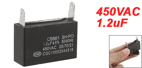 Product Name Motor Capacitor Housing Material Plastic Dielectric Material Polypropylene Film Model CBB61 Capacitance 1.2uF Tolerance 5% Rated Voltage 450VAC Frequency 50/60Hz Temperature -25~70 Celsius Degree Pin Spacing(Approx.) 3.25cm/1.28" Overall Size 3.5 x 2.4 x 3.2cm/1.4" x 0.9" x 1.3" (L*W*H) Color Black Weight 12g Package Content 1 x Motor Capacitor - Reviews