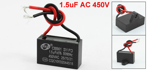 Product Name Capacitor Housing Material Plastic Dielectric Material Polypropylene Film Model CBB61 Terminal 2 Wired Capacitance 1.5uF Tolerance ±5% Rated Voltage 450VAC Temperature Coefficient 25/70/21 Frequency 50/60Hz Overall Size 3.5 x 1.2 x 2.2cm/1.4" x 0.47" x 0.87"(L*W*H) Mounting Hole Dia 4.5mm/0.18" Color Black Weight 15g