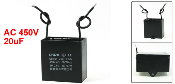 Product Name Motor Capacitor Model CBB61 External Material Plastic Dielectric Material Metalized Polypropylene Film Rated Capacitance 20uF Tolerance +/-5% Rated Frequency 50/60Hz Rated Voltage AC 450V Body Size 59 x 31 x 58mm/ 2.3" x 1.2" x 2.3"(L*W*T) Fixing Hole Diameter 4mm/0.16" Cable Length 12cm/ 4.7" Net Weight 116g Package Content 1 x Motor Run Capacitor - Reviews