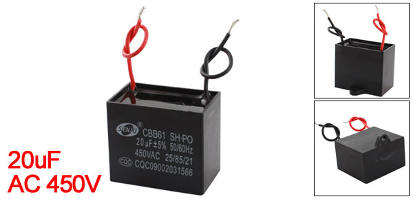 Product Name Motor Capacitor Model CBB61 Material(External) Plastic Main Color Black Rated Capacitance 20uF Frequency 50/60Hz Rated Voltage AC 450V Size 50 x 31 x 44mm / 2.0" x 1.2" x 1.7" (L*W*H) Cable Length 9cm / 3.5" Weight 78g Package Content 1 x Motor Capacitor - Reviews
