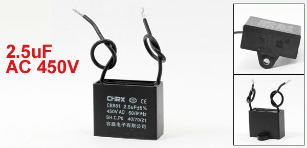 Product Name Motor Capacitor Model CBB61 External Material Plastic Dielectric Material Metalized Polypropylene Film Rated Capacitance 2.5uF Tolerance +/-5% Rated Frequency 50/60Hz Rated Voltage AC 450V Body Size 37 x 16 x 30mm/ 1.5" x 0.6" x 1.2"(L*W*T) Fixing Hole Diameter 4mm/0.16" Cable Length 9cm/ 3.5" Net Weight 23g Package Content 1 x Motor Run Capacitor - Reviews