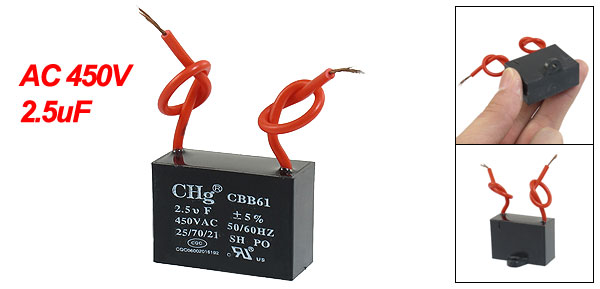Product Name Motor Capacitor Model CBB61 External Material Plastic Dielectric Material Metalized Polypropylene Film Rated Capacitance 2.5uF Tolerance +/-5% Rated Frequency 50/60Hz Rated Voltage AC 450V Body Size 3.7 x 2.6 x 1.6cm/ 1.5" x 1" x 0.6"(L*W*T) Fixing Hole Diameter 4mm/0.15" Cable Length 9cm/ 3.5" Net Weight 21g Package Content 1 x Motor Run Capacitor - Reviews