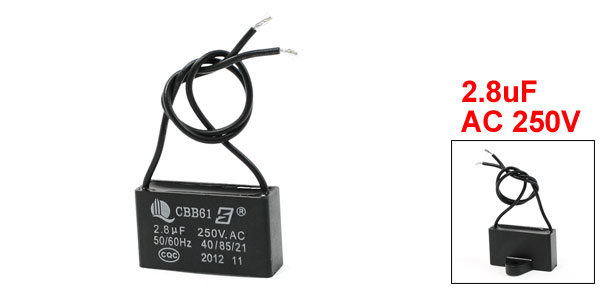 Product Name Motor Capacitor Model CBB61 External Material Plastic Dielectric Material Metalized Polypropylene Film Rated Capacitance 2.8uF Tolerance ±5% Rated Frequency 50/60Hz Rated Voltage AC 250V Body Size 3.7 x 2.1 x 1.1cm/ 1.5" x 0.8" x 0.4"(L*W*T) Fixing Hole Diameter 5mm/0.2" Cable Length 12cm/ 4.7" Net Weight 12g Package Content 1 x Motor Start Capacitor - Reviews