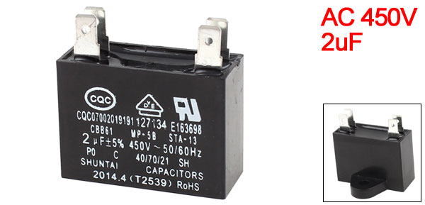 Product Name Motor Capacitor Model CBB61 for Air Conditioner, Ceiling Fan Capacitance 2uF Tolerance ± 5% Rated Voltage AC 450V Temperature Coefficient 40/70/21 Frequency 50/60Hz Pin Count 4 Pin Size 6 x 1mm/0.24" x 0.04" Pin Spacing(Approx.) 20mm/0.8" Overall Size 3.8 x 2.7 x 1.6cm/1.5" x 1.1" x 0.6"(L*W*H) Main Material Polypropylene Film Color Black Weight 20g