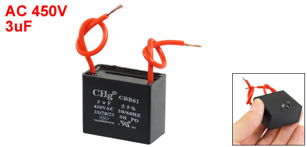 Product Name Motor Capacitor Model CBB61 External Material Plastic Dielectric Material Metalized Polypropylene Film Rated Capacitance 3uF Tolerance +/-5% Rated Frequency 50/60Hz Rated Voltage AC 450V Body Size 4.8 x 3.1 x 2cm/ 1.9" x 1.2" x 0.8"(L*W*T) Fixing Hole Diameter 5mm/0.2" Cable Length 9cm/ 3.5" Net Weight 29g Package Content 1 x Motor Run Capacitor - Reviews