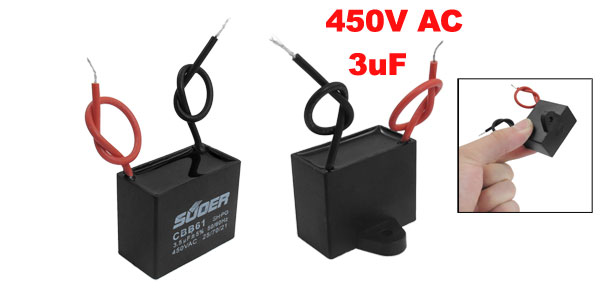 Product Name Motor Capacitor Material(External) Plastic Rated Capacitance 3uF Tolerance +/-5% Rated Frequency 50/60Hz Rated Voltage 450V AC Size 3.7 x 3 x 2cm /1.45" x 1.18" x 0.79"(L*W*T) Cable Length 9cm / 3.5" Weight 30g Package Content 1 x Motor Run Capacitor - Reviews