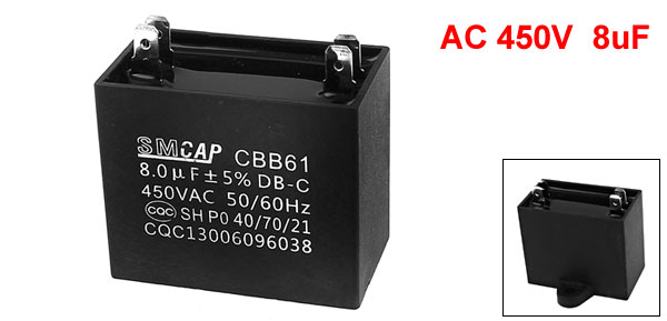 Product Name Capacitor Housing Material Plastic Dielectric Material Polypropylene Film Model CBB61 Capacitance 8uF Tolerance ±5% Rated Voltage 450VAC Temperature Coefficient 40/70/21 Frequency 50/60Hz Overall Size 4.6 x 3.8 x 3.8cm/1.8" x 1.5" x 1.5"(L*W*H) Mounting Hole Dia 5mm/0.2" Color Black Weight 63g