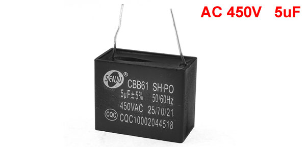 Product Name Air Condition Capacitor Material Polypropylene Film Model CBB61 Rated Capacitance 5uF Rated Frequency 50/60 Hz Rated Voltage AC 450V Overall Size 38 x 31 x 20mm / 1.5" x 1.2" x 0.8" (L*W*T) Pin Size 20 x 0.9mm / 0.8" x 0.035" (L*D) Pin Spacing 29mm / 1.1" Main Color Black Net Weight 23g Package Content 1 x Air Condition Capacitor - Reviews