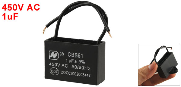 Product Name Motor Capacitor Housing Material Plastic Dielectric Material Metallized Polypropylene Film Model CBB61 Capacitance 1uF Tolerance 5% Rated Voltage 450VAC Frequency 50/60Hz Body Size 3.7 x 1.4 x 2.5m/ 1.5" x 0.55" x 0.1" (H * W * T) Wire Length 6.5cm/ 2.56" Color Black Weight 17g Package Content 1 x Motor Capacitors - Reviews