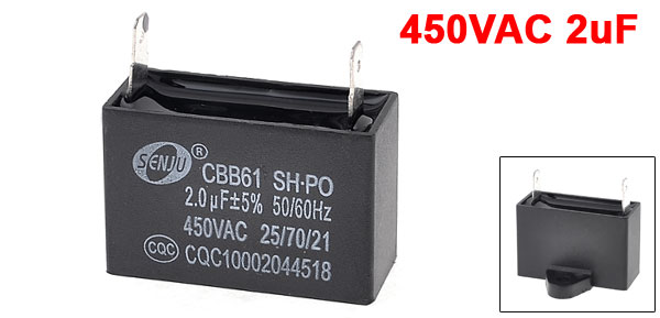 Product Name Motor Capacitor Model CBB61 Color Black External Material Plastic Dielectric Material Metalized Polypropylene Film Rated Capacitance 2uF Tolerance ±5% Rated Frequency 50/60Hz Rated Voltage AC 450V Pin Number 2 Pin Spacing 30mm/ 1.18" Pin Size 10 x 6mm/ 0.39" x 0.24"(L*W) Body Size 38 x 25 x 29mm/ 1.4" x 1" x 1.14"(L*W*T) Fixing Hole Diameter 4mm/0.15" Net Weight 21g Package Content 1 x Motor Run Capacitor  - Reviews
