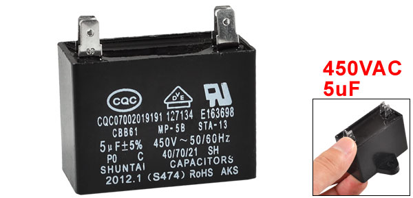 Product Name Capacitor Model CBB61 Dielectric Material Metallized Polypropylene External Material Plastic Rated Capacitance 5uF Tolerance +/-5% Rated Frequency 50/60Hz Rated Working Voltage 450VAC Pin Number 4 Mounting Hole Diameter 5mm/ 0.197" Pin Size 8 x 6mm/ 0.31" x 0.24" (L*W) Pin Spacing 30 x 5.5mm/ 1.18" x 0.22" (L*W) Total Size(Approx) 4.7 x 3.5 x 4.4cm/ 1.9" x 1.4" x 1.7" (L*W*H) Main Color Black Weight 48g Package Content 1 x Capacitor - Reviews