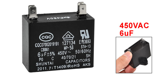 Product Name Run Capacitor Model CBB61 Dielectric Material Metallized Polypropylene External Material Plastic Rated Capacitance 6uF Tolerance ±5% Rated Frequency 50/60Hz Rated Working Voltage 450VAC Pin Number 4 Mounting Hole Diameter 5mm/ 0.197" Pin Size 8 x 6mm/ 0.31" x 0.24" (L*W) Pin Spacing 30 x 5.5mm/ 1.18" x 0.22" (L*W) Total Size(Approx) 4.7 x 3.5 x 4.4cm/ 1.9" x 1.4" x 1.7" (L*W*H) Main Color Black Weight 48g Package Content 1 x Run Capacitor - Reviews