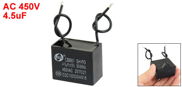 Product Name Motor Capacitor Model CBB61 External Material Plastic Dielectric Material Metalized Polypropylene Film Rated Capacitance 4.5uF Tolerance +/-5% Rated Frequency 50/60Hz Rated Voltage AC 450V Body Size 4 x 3.2 x 2.3cm/ 1.6" x 1.3" x 0.9"(L*W*T) Fixing Hole Diameter 5mm/0.2" Cable Length 9cm/ 3.5" Net Weight 36g Package Content 1 x Motor Run Capacitor - Reviews